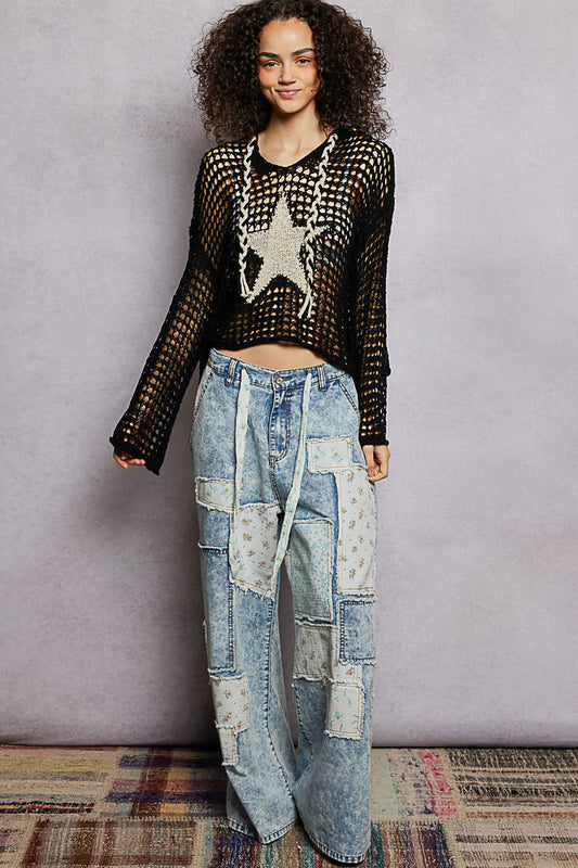 V-Neck L/S Crochet Hoodie with Star Patch