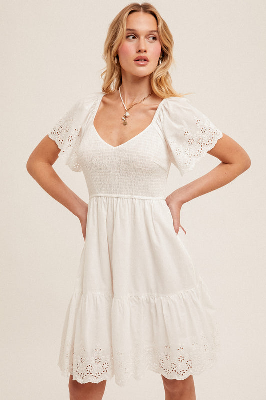 Smocked Detail Eyelet Tiered Babydoll Dress