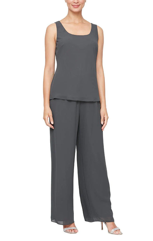 3pc Chiffon Pantsuit with Pointed Tiered Hem Open Jacket