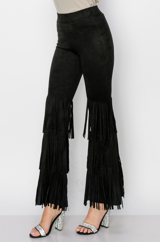 High Rise Suede Knit Bell Bottom Pants with Fringes