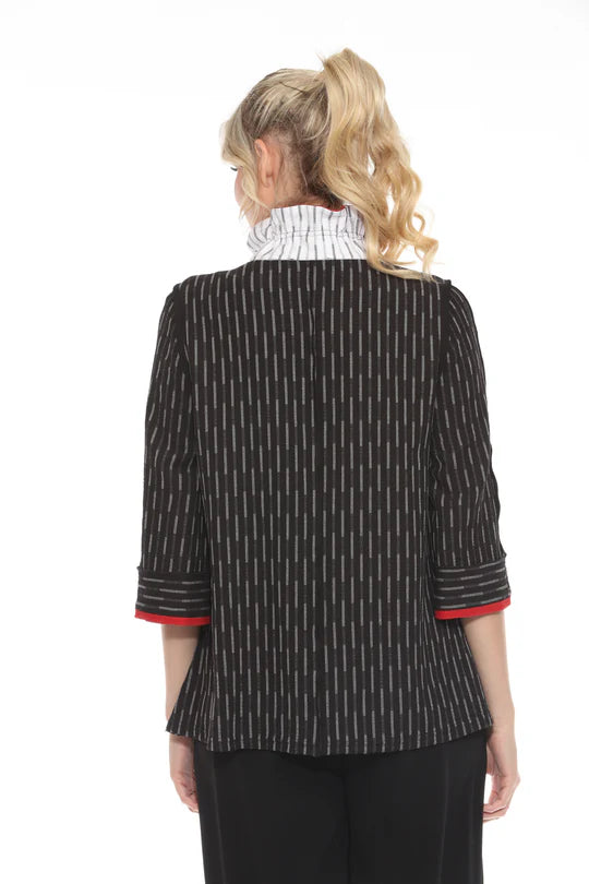 Elevate your wardrobe with our contemporary design featuring stylish 3/4" sleeves and an eye-catching color-blocked pattern. The button closure adds a sophisticated touch, making it a must-have for any fashion-forward individual.