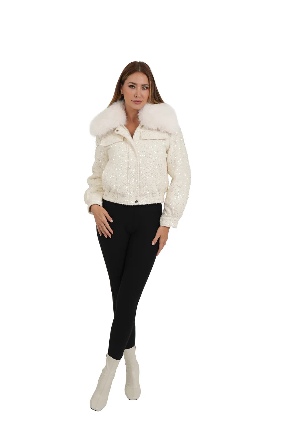 Brianne sequin bomber jacket, tweed fabric, faux fur collar, front zip & snap combo closure, faux pockets at chest, welt pockets at waist, stretch hem, relaxed fit.