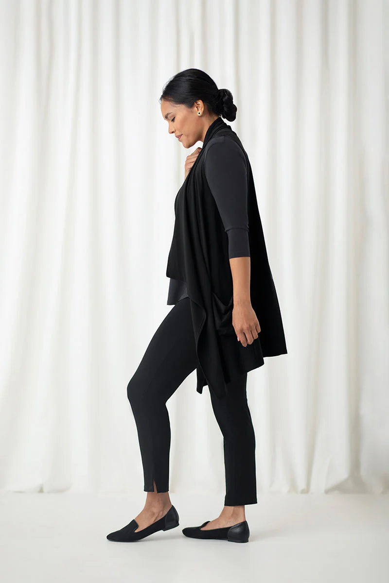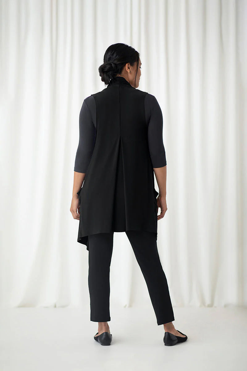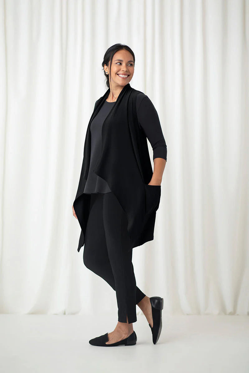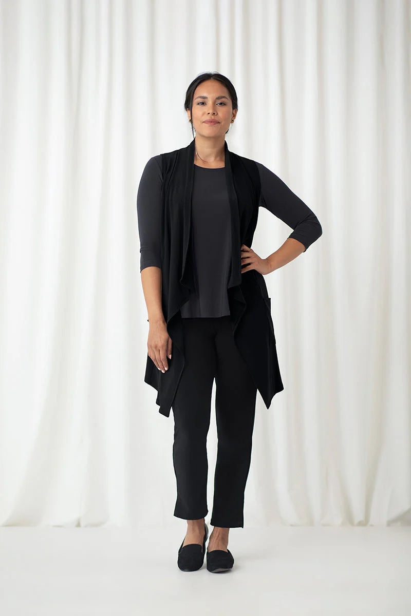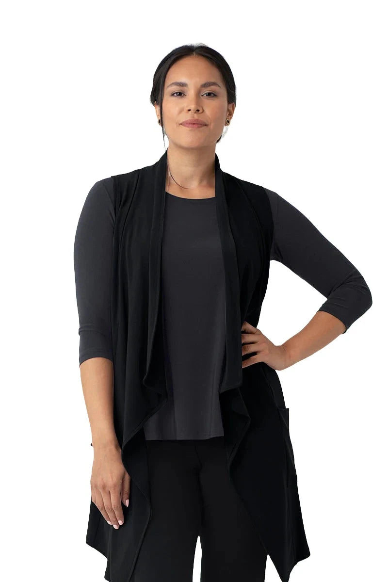 - A luxurious open front vest with a chic waterfall collar that sits mid-length, an effortless all year round style.