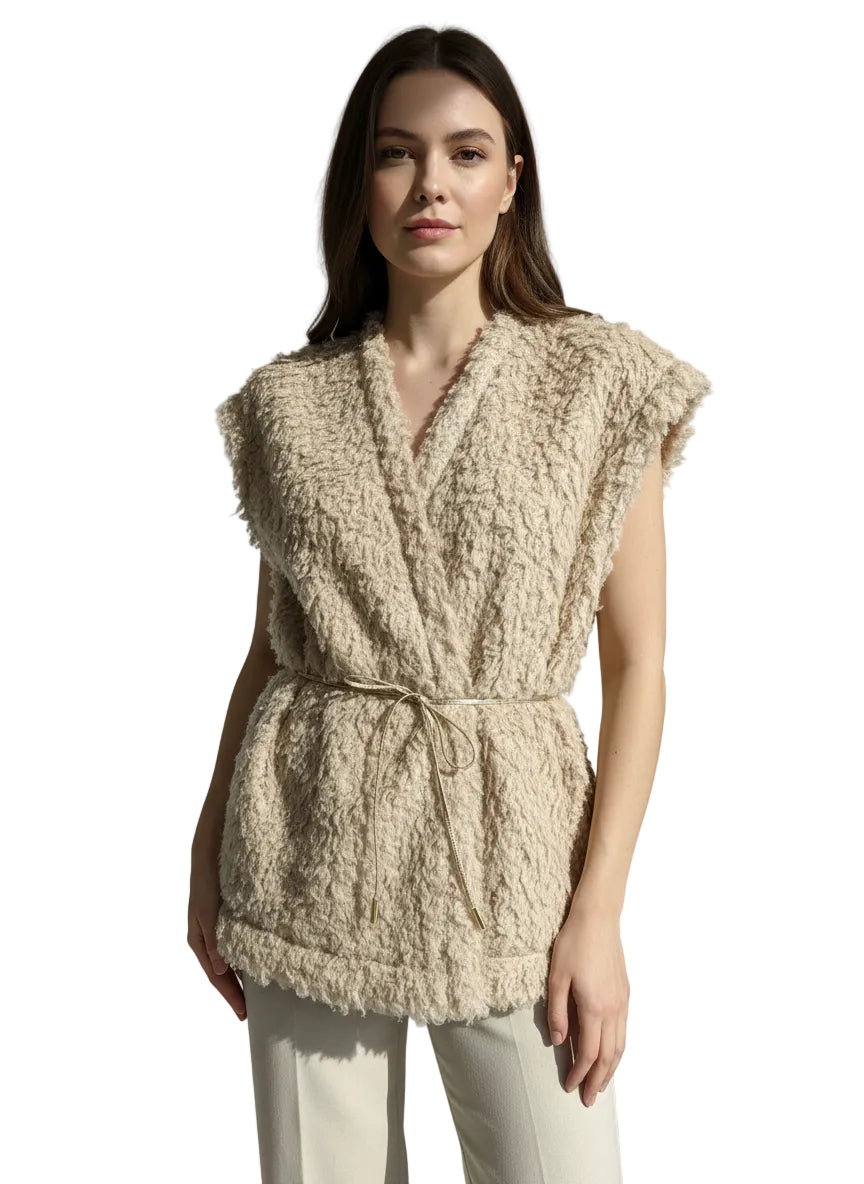 Experience ultimate comfort and style with our luxurious fuzzy fleece-lined vest, elegantly accented by a stunning gold leather faux belt. Crafted from 100% high-quality polyester, this piece adds a touch of sophistication to any outfit while keeping you warm. Don't miss out on this must-have addition to your wardrobe!
