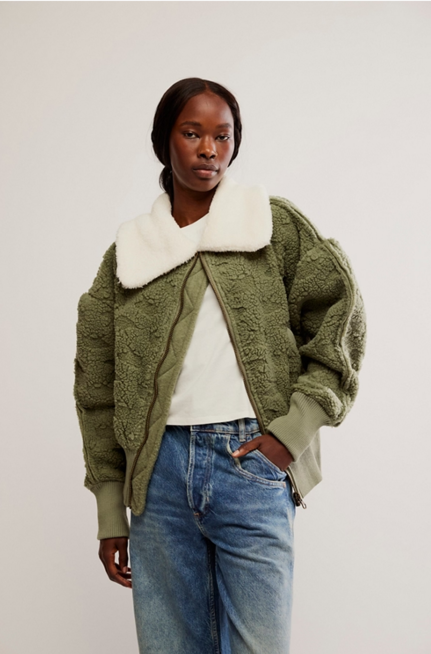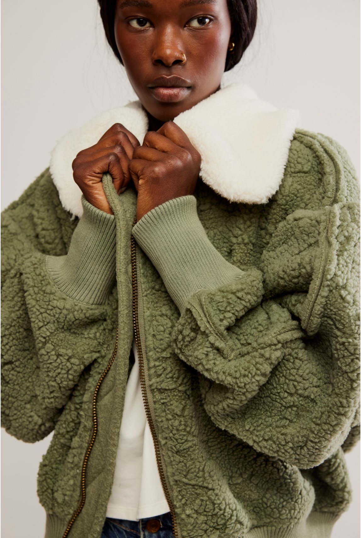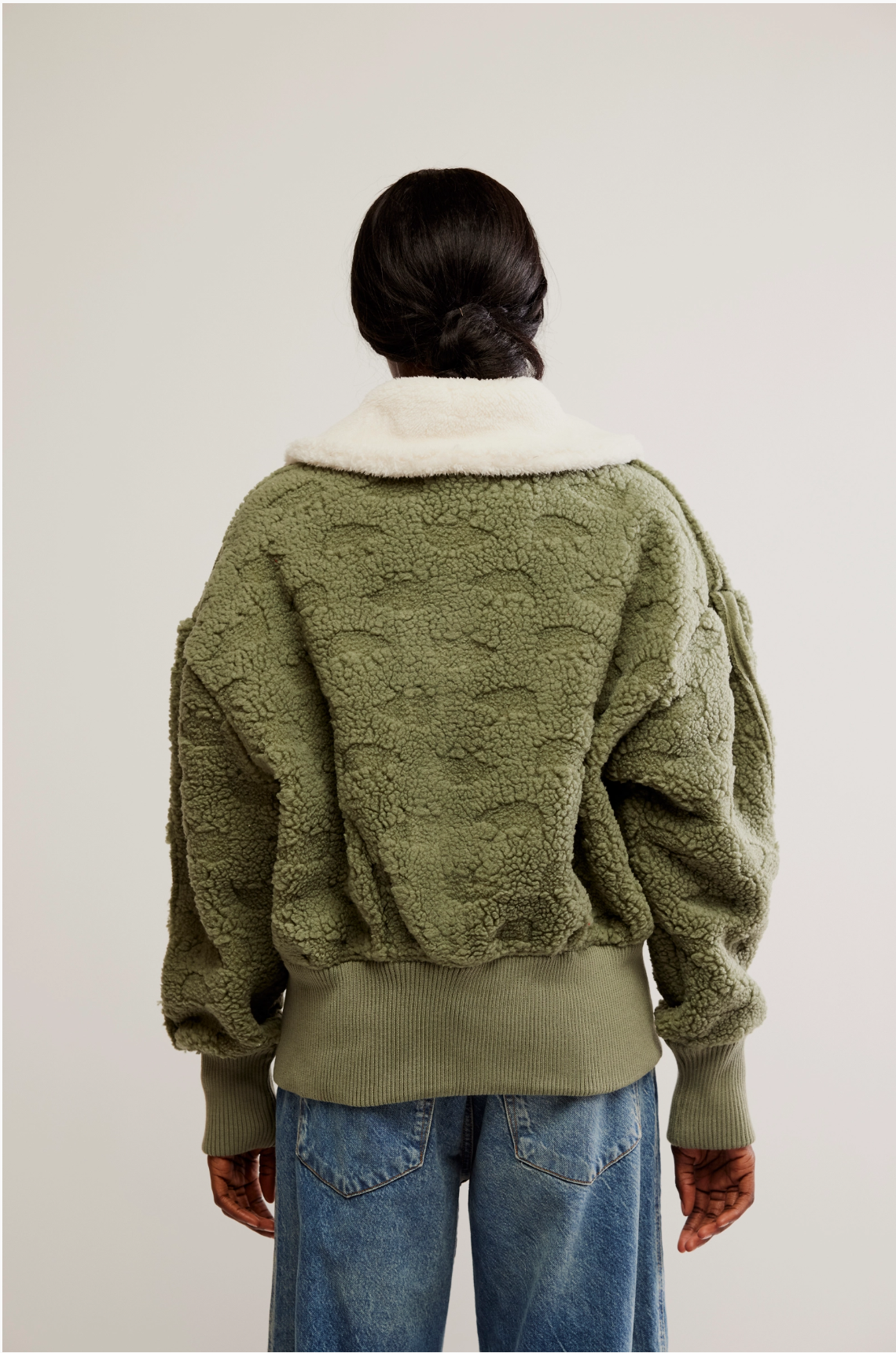 Features: Cozy sherpa fabrication, exaggerated collar, front-zip closure, drop-shoulder sleeves with elasticated cuffs, ribbed hems, pockets for hands