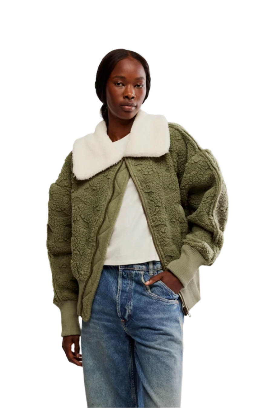 Effortlessly cool and cozy, this soft cardi features a sherpa fabrication and exaggerated collar detail with a front-zip closure and ribbed hems.