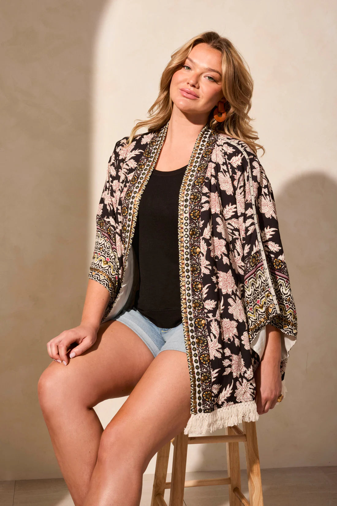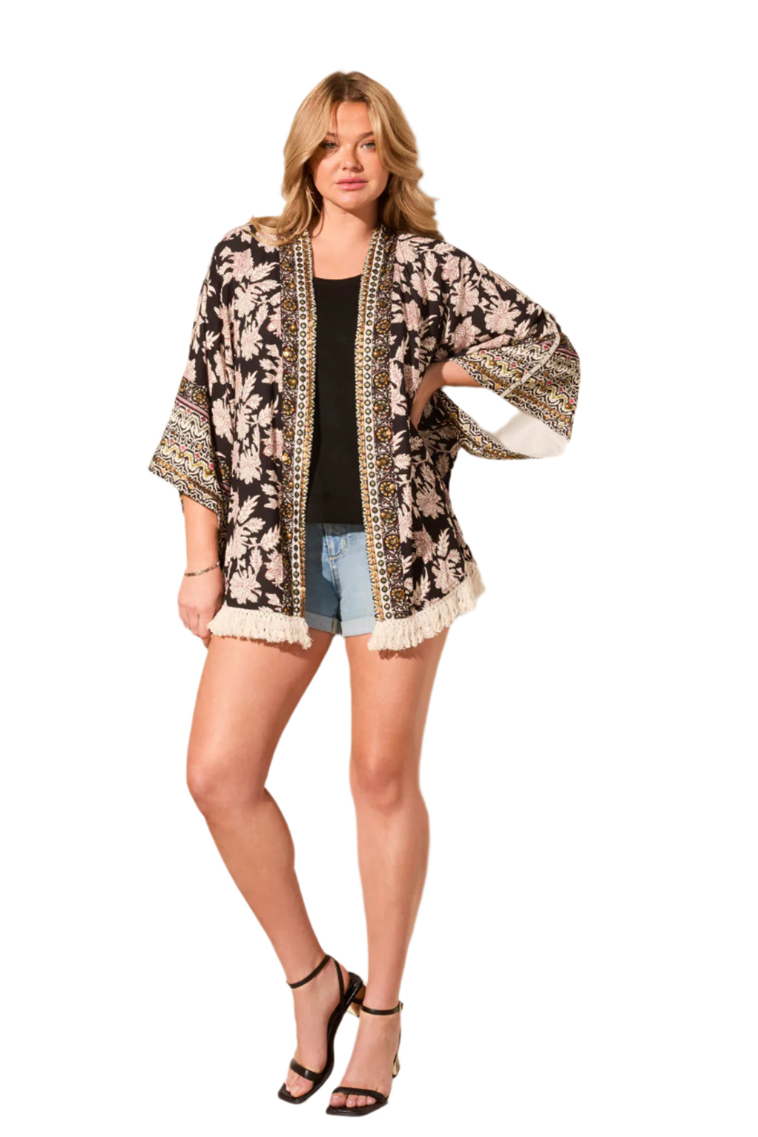 Embelished Kimono Sleeve Soft Fringed Jacket