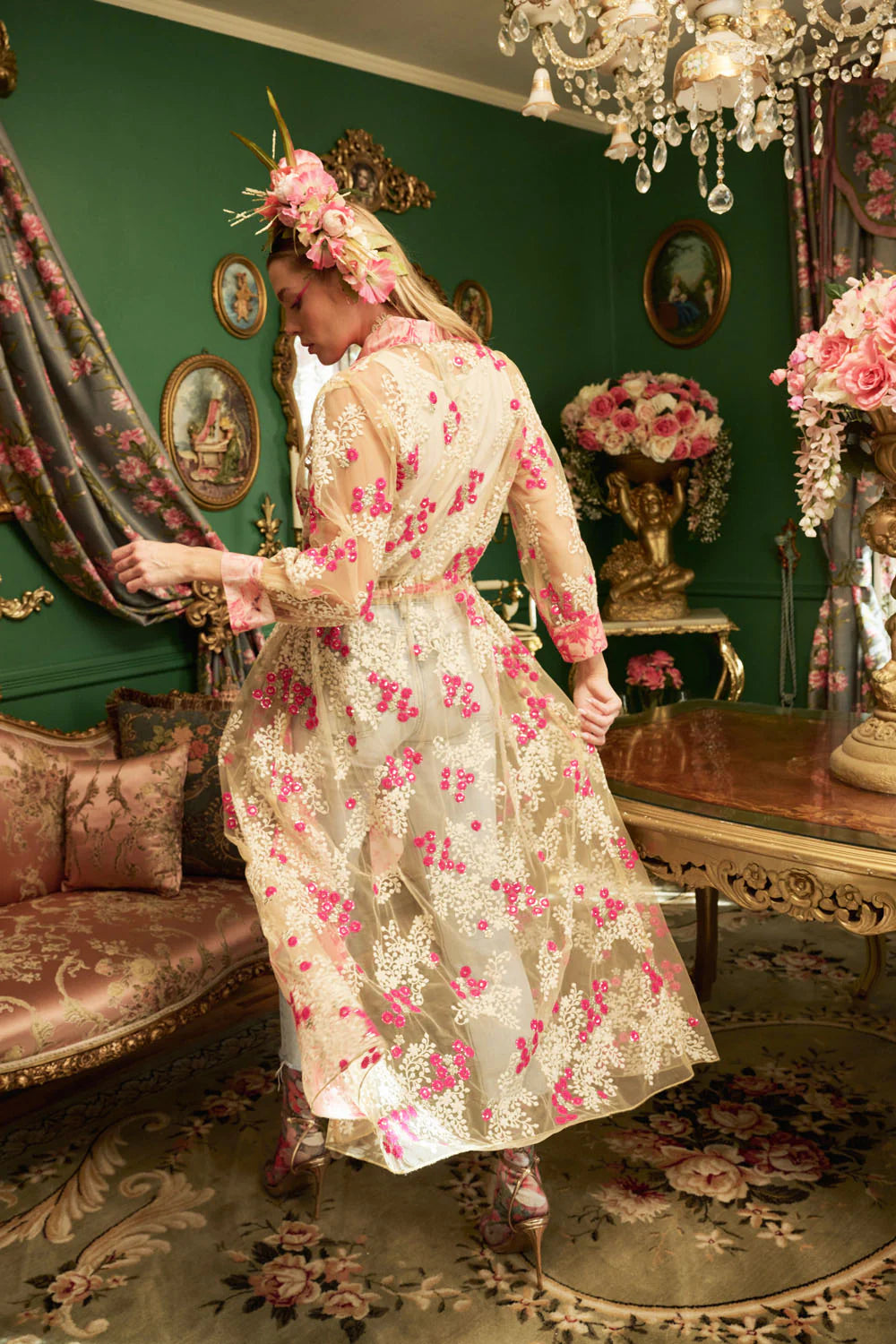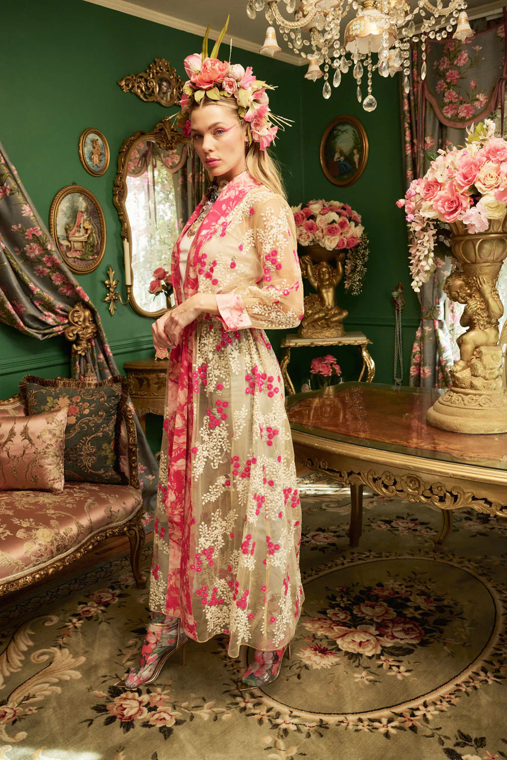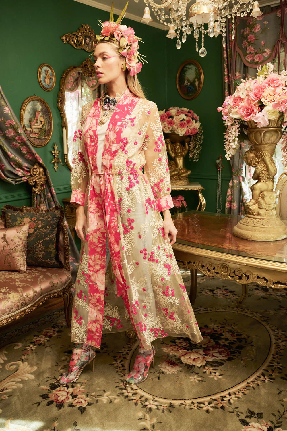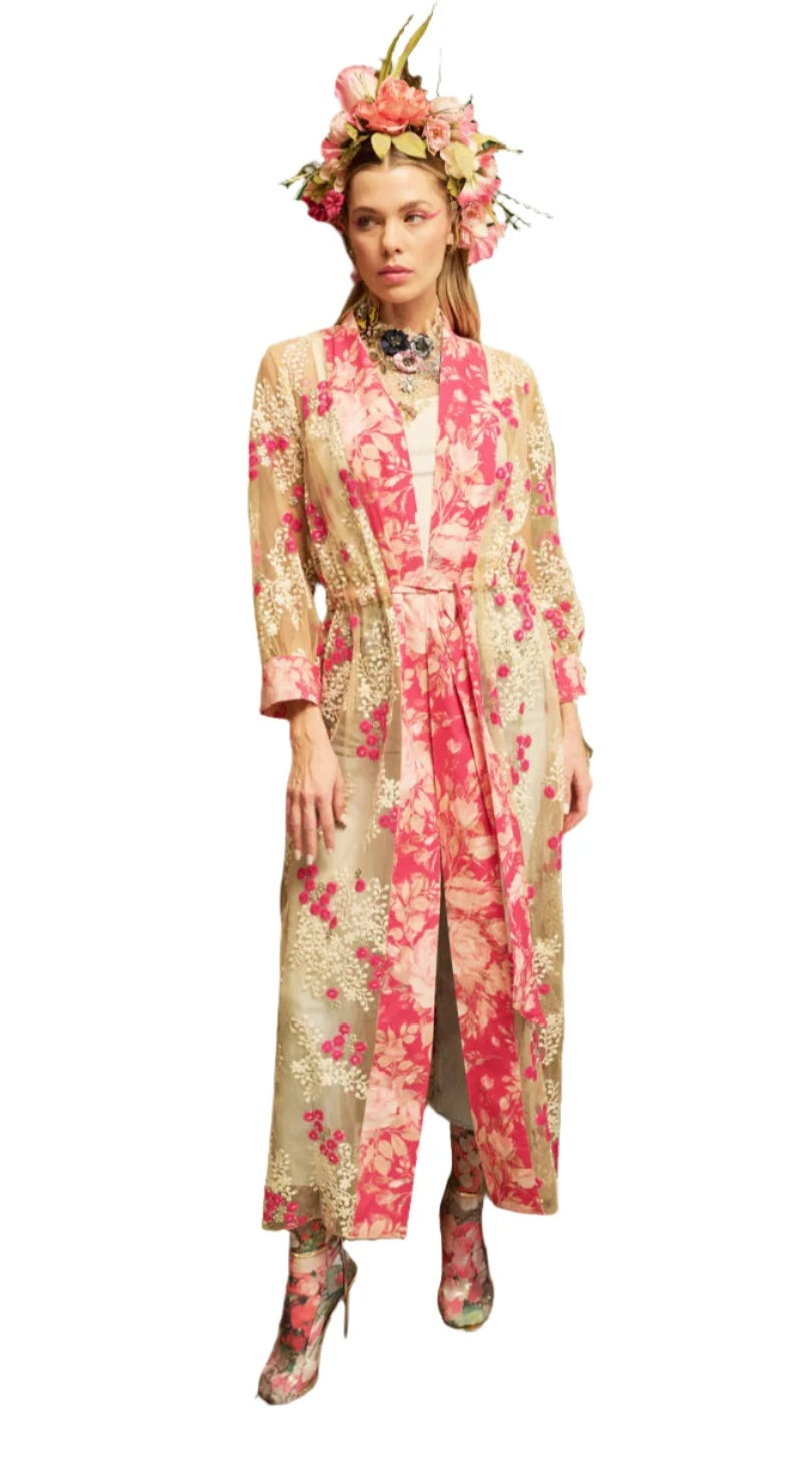 - Sequin embroidered mesh duster with floral print CF placket, belt & cuffs