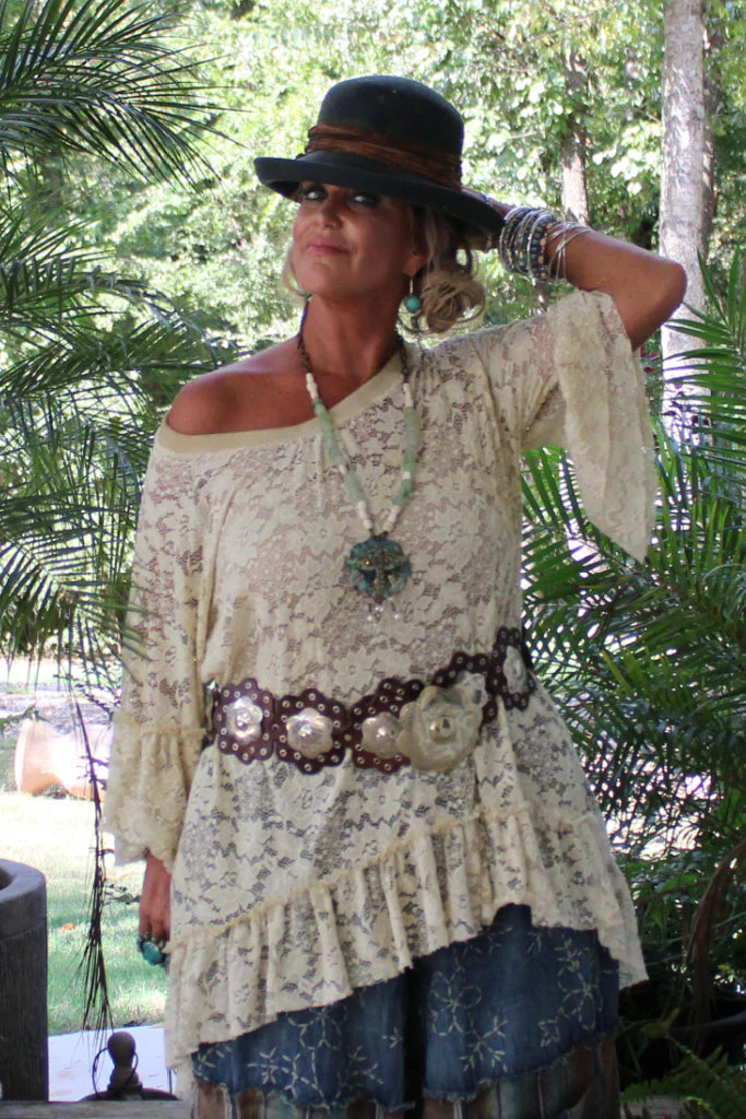Discover the perfect blend of style and versatility with our off-the-shoulder top featuring a graceful round neckline. The elegant 3/4 sleeves and unique uneven hemline adorned with delicate lace flounce detail create a beautiful silhouette. Whether you choose to cinch it with a belt for a polished look or wear it loose for effortless charm, this top is an essential layering piece that will elevate any outfit. Embrace your style and make a statement!