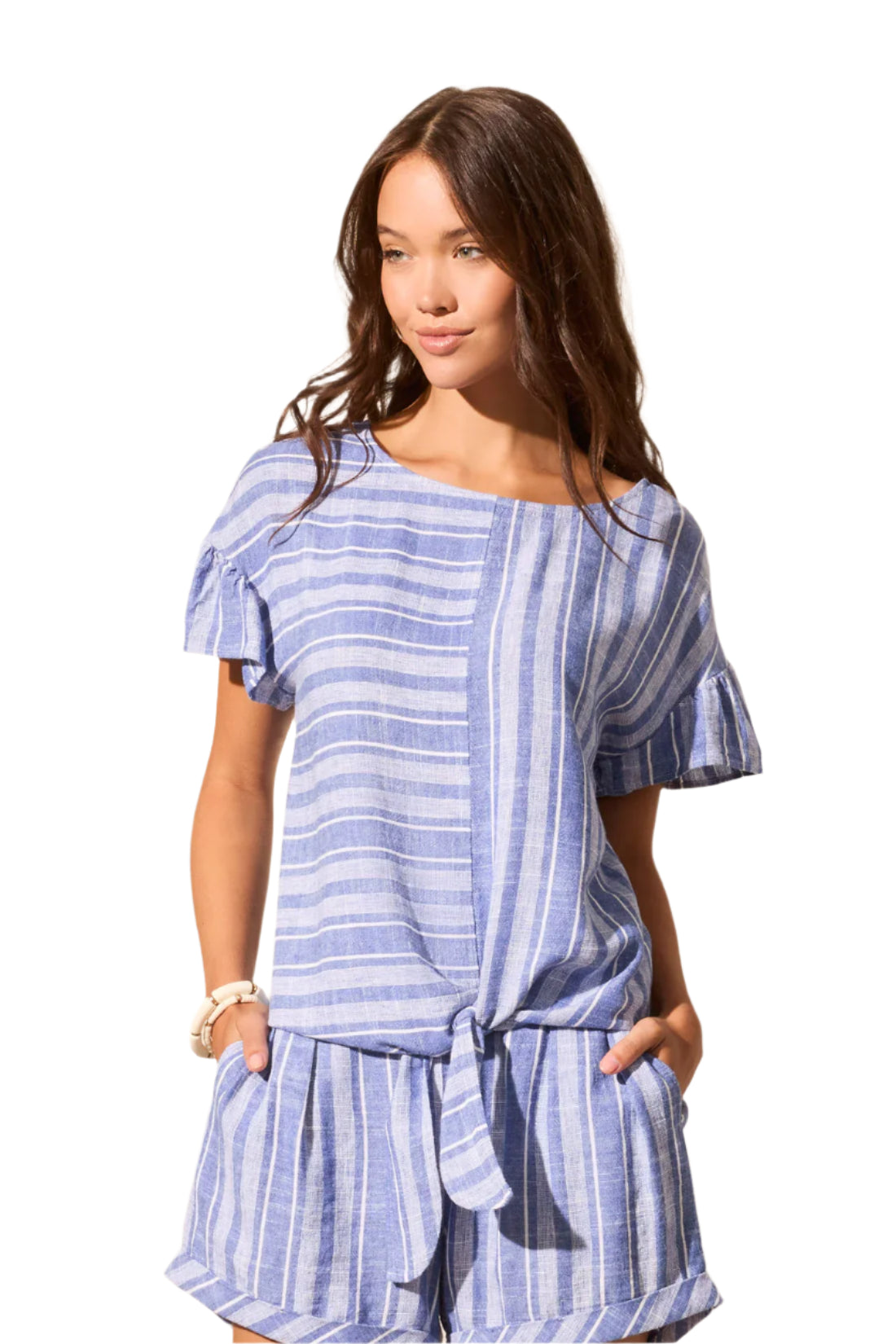 Linen Blend Tie-Front Blouse With Frilled Sleeves