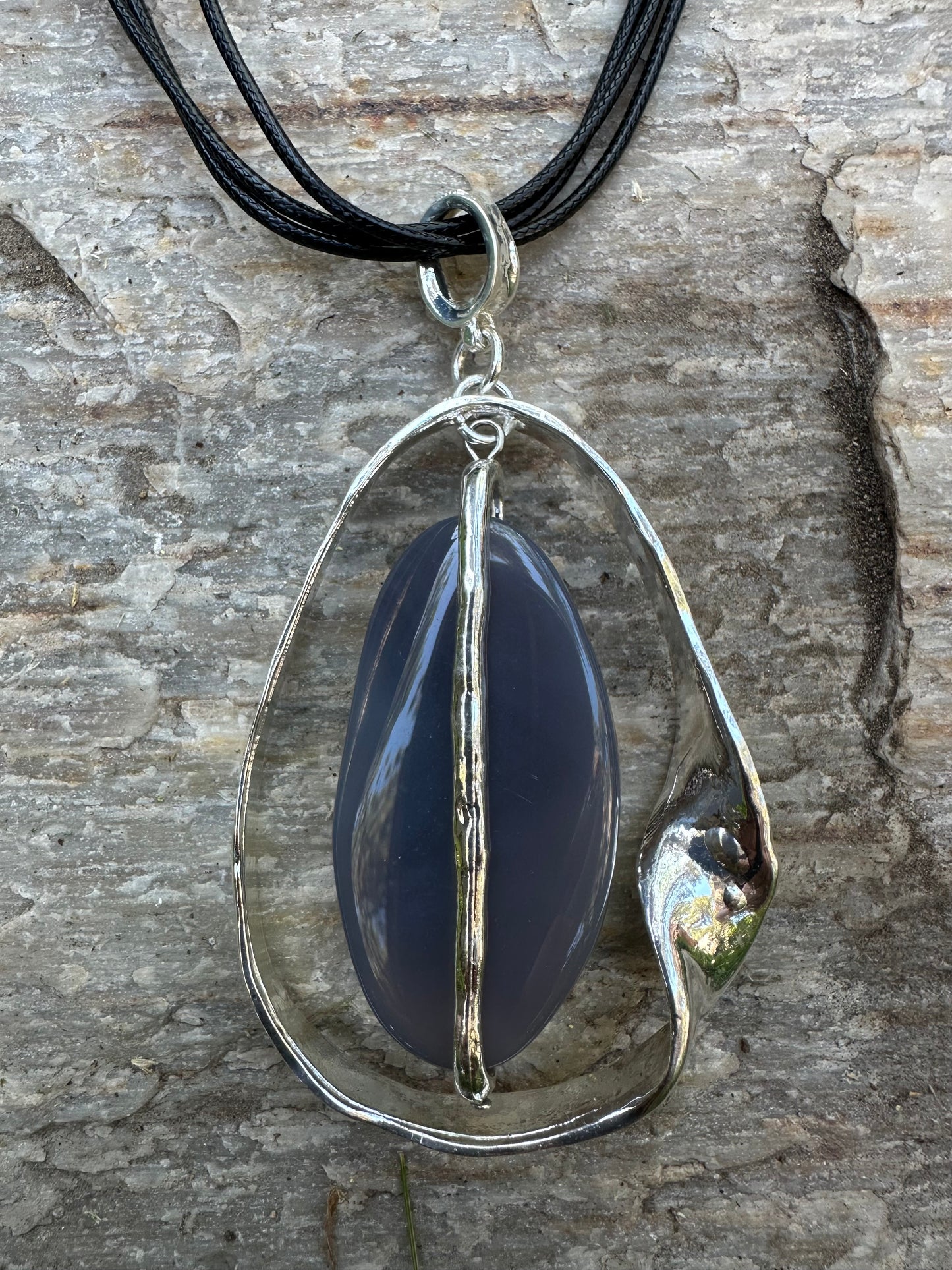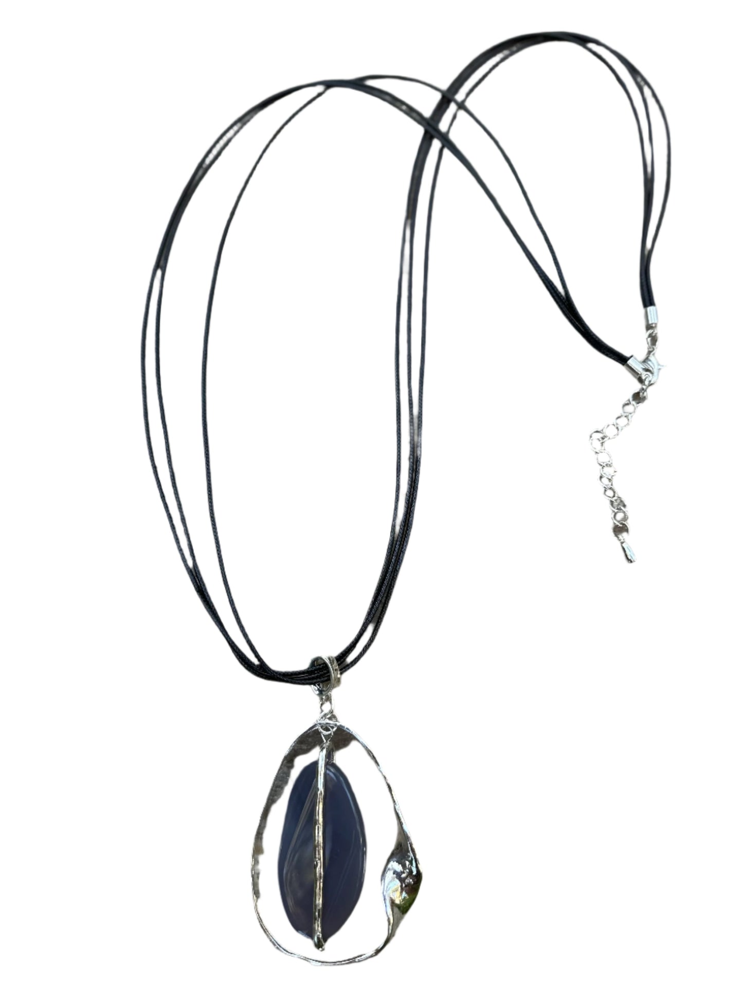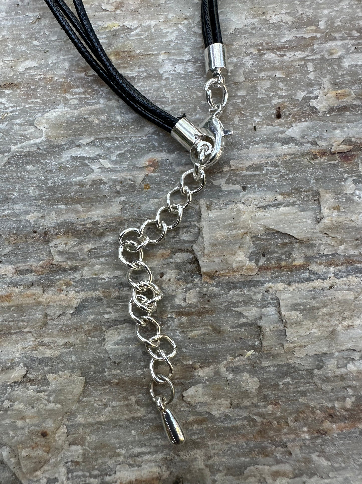 This black cord necklace has a silver and stone drop pendant. It adds fun and character to any ensemble.