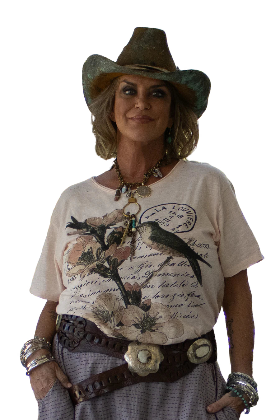 Experience style and comfort with this beautifully designed top. Featuring short sleeves and an elegant scoop neckline, it showcases a charming bird and flower motif that adds a touch of nature-inspired beauty. The distressed finish lends a trendy, laid-back vibe, while the 100% cotton fabric ensures softness and breathability. Elevate your wardrobe with this must-have piece!