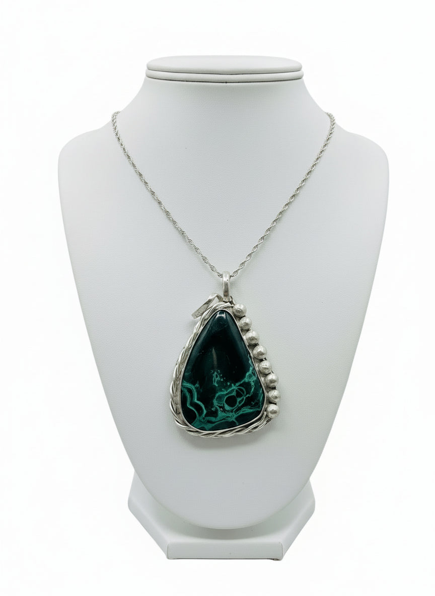 Discover the captivating beauty of a chrysocolla pendant, expertly crafted from natural stone and elegantly set in luxurious sterling silver. This stunning piece is not just jewelry; it's a statement of style and sophistication that will elevate any outfit.
