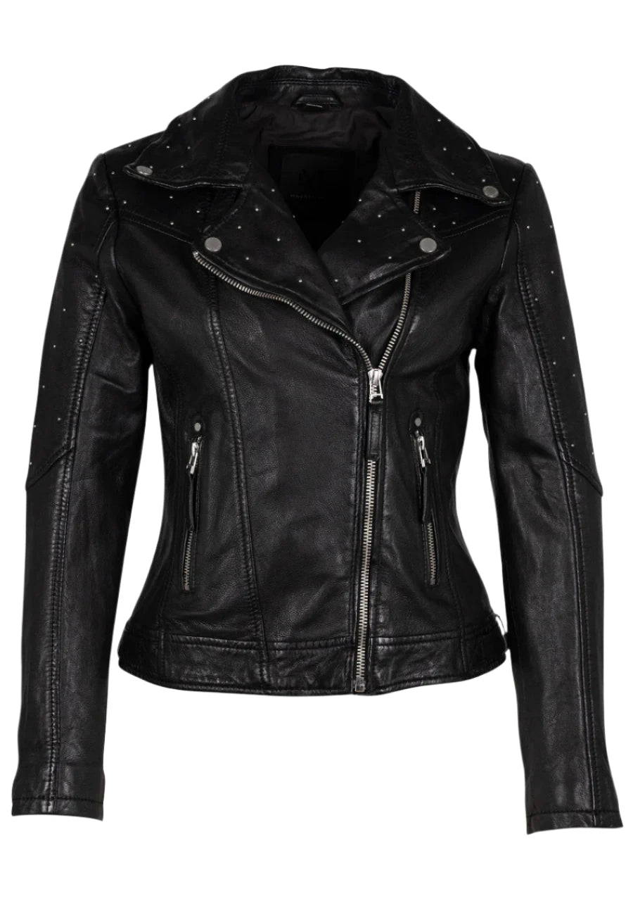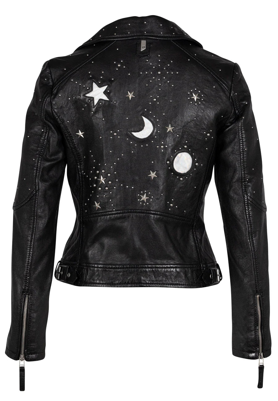 Expertly crafted with a classic moto style, the Noelia Leather Jacket in black boasts a unique sun, moon, and star design for a touch of celestial charm. The galaxy-inspired feel is further elevated with studded accents on the arms and lapels. Channel your inner fashionista with this must-have addition to your wardrobe.