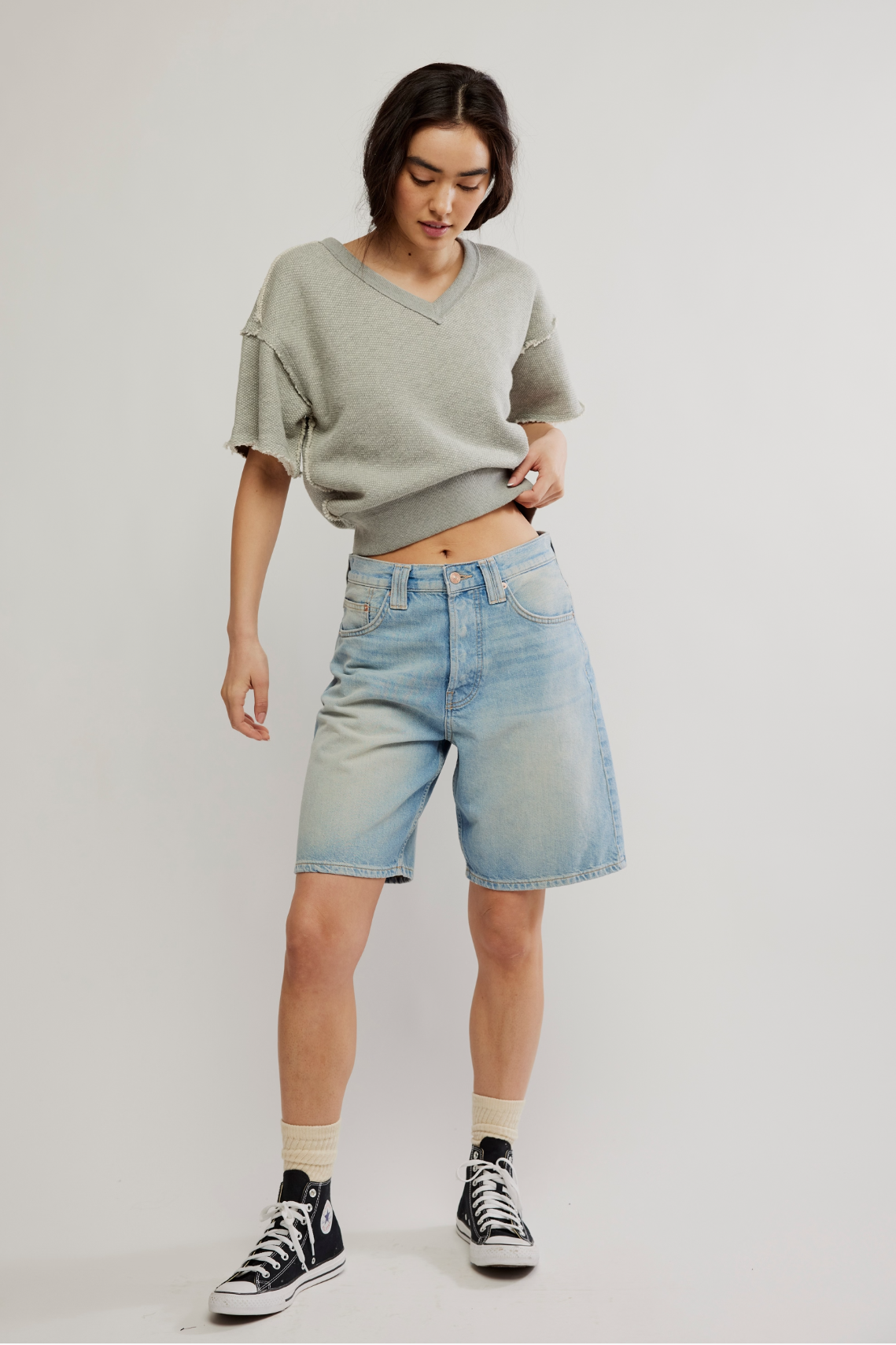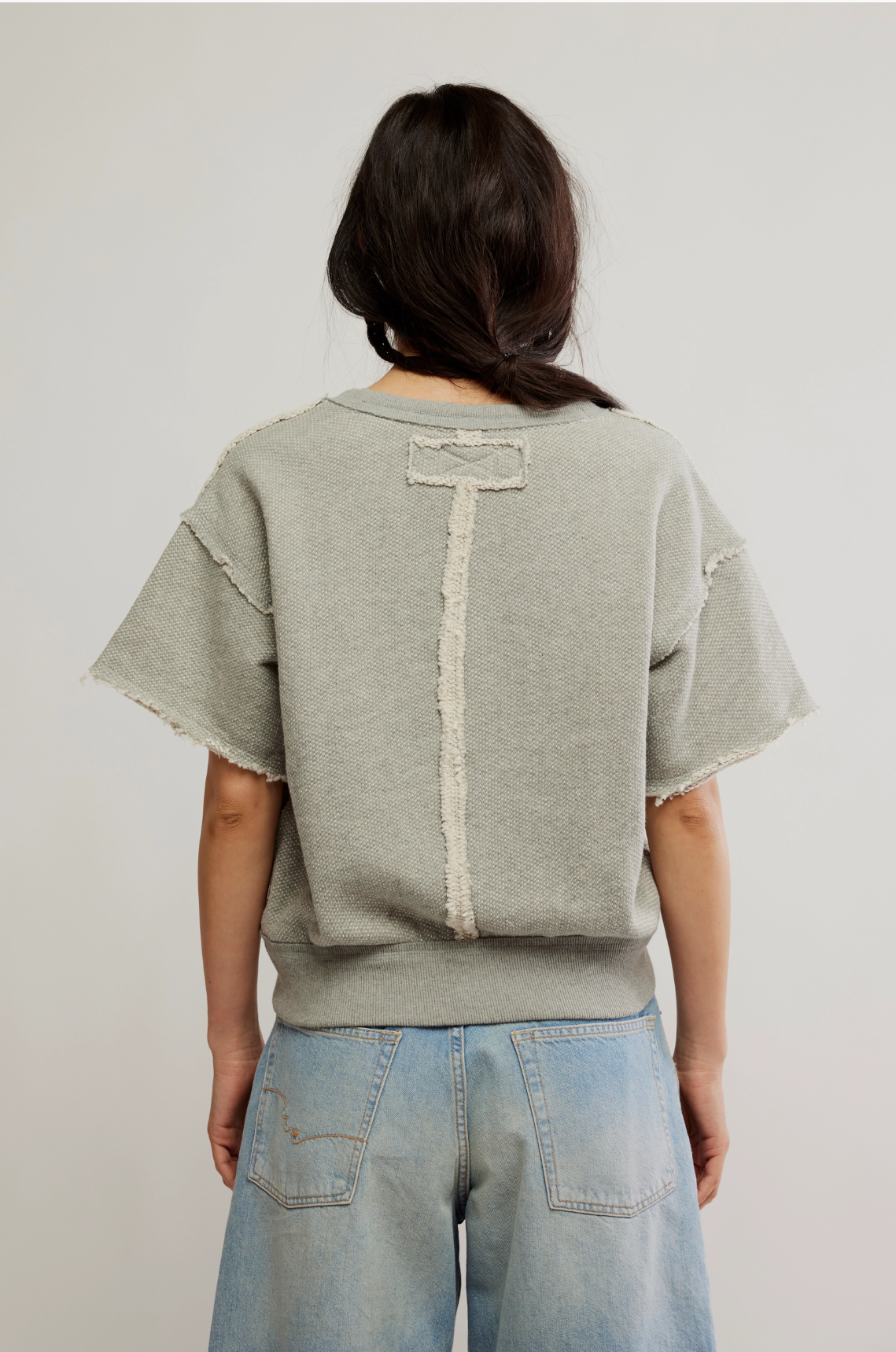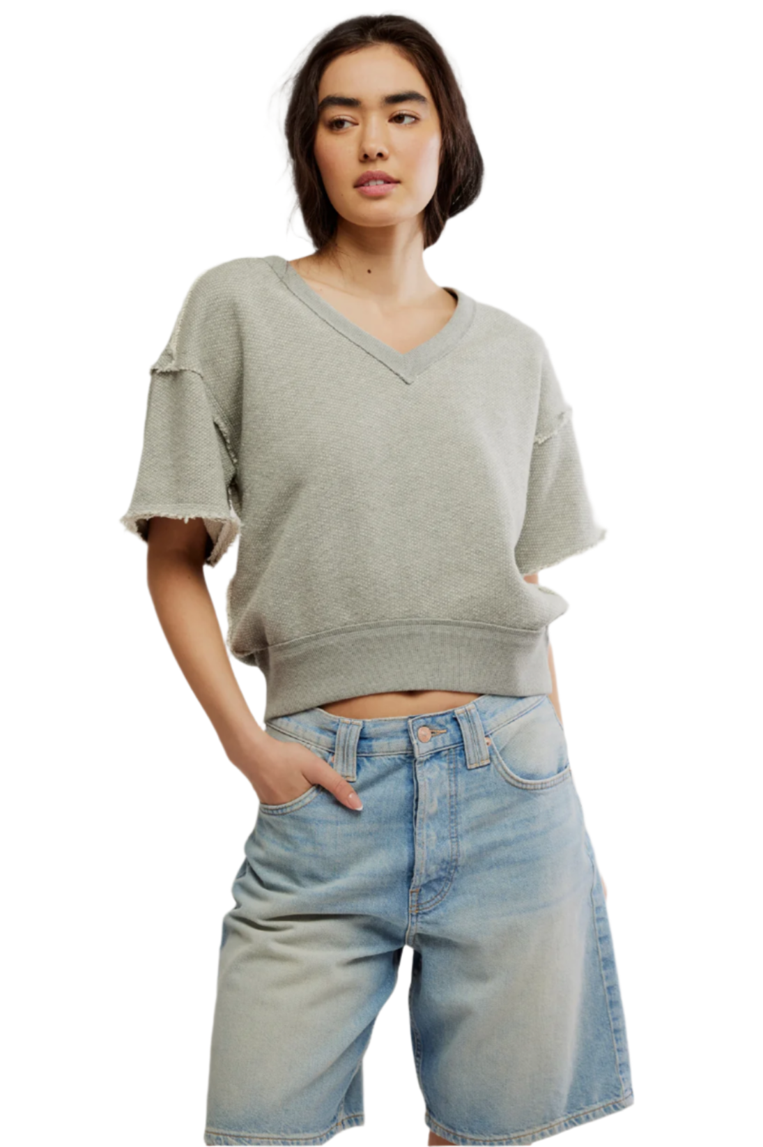 Enjoy a bold, modern aesthetic with stylish raw edges that make a statement. The flattering V-neck design beautifully accentuates your neckline, while the comfortable short sleeves offer a relaxed fit perfect for any occasion. Plus, the trendy cropped length is ideal for pairing with high-waisted bottoms, ensuring a chic and effortlessly fashionable look.