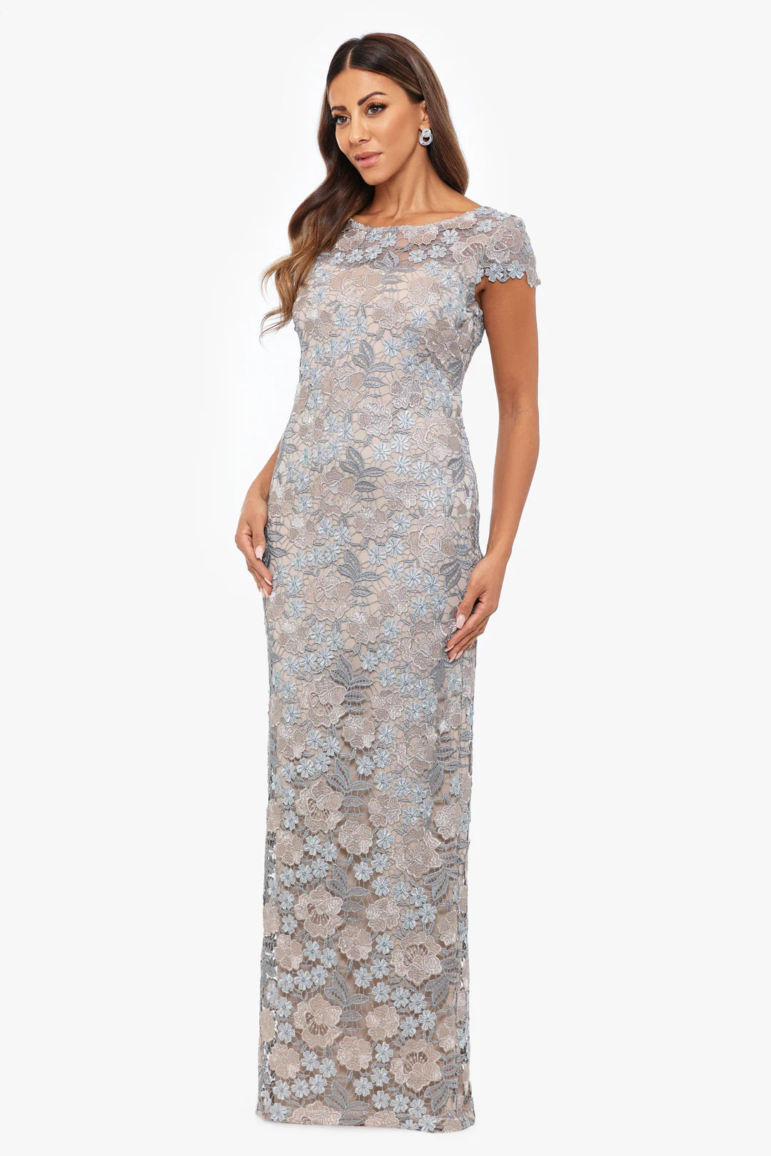 - Details: Short Sleeves, Cuffed Top, Slit Back, Floor Length