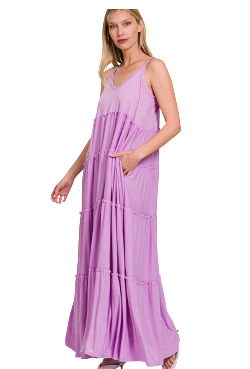 V-Neck Tiered Cami Maxi Dress with Side Pockets
